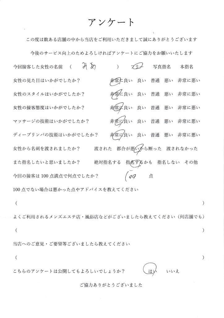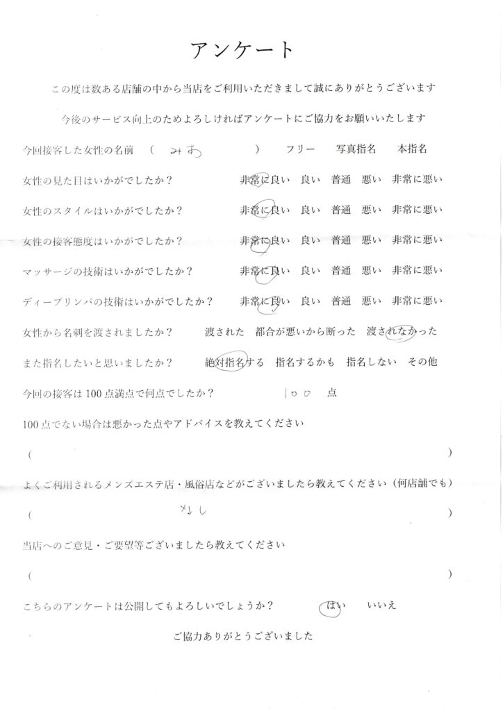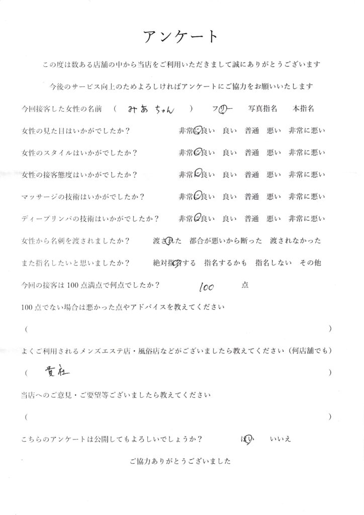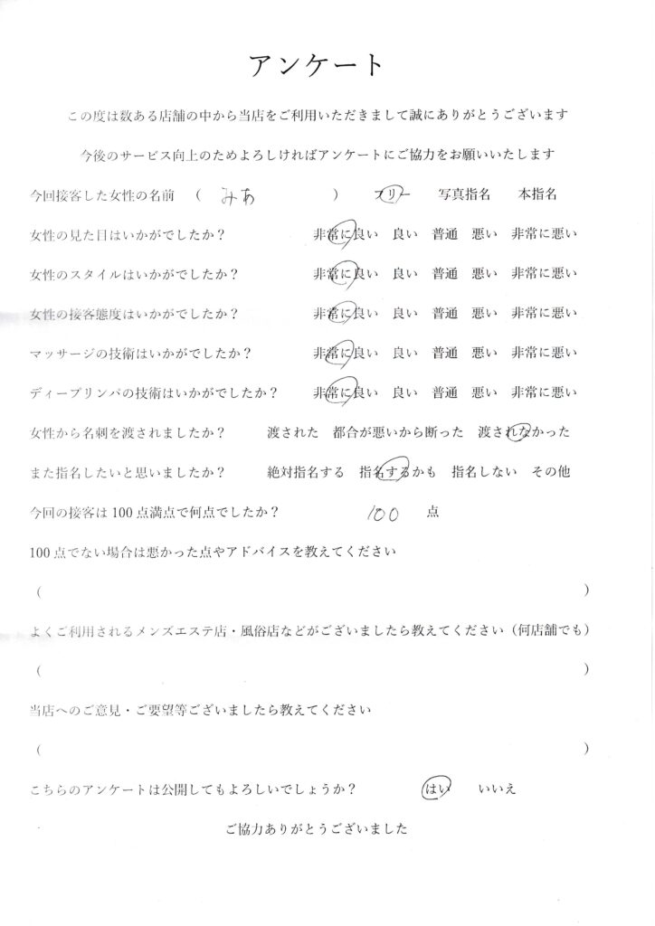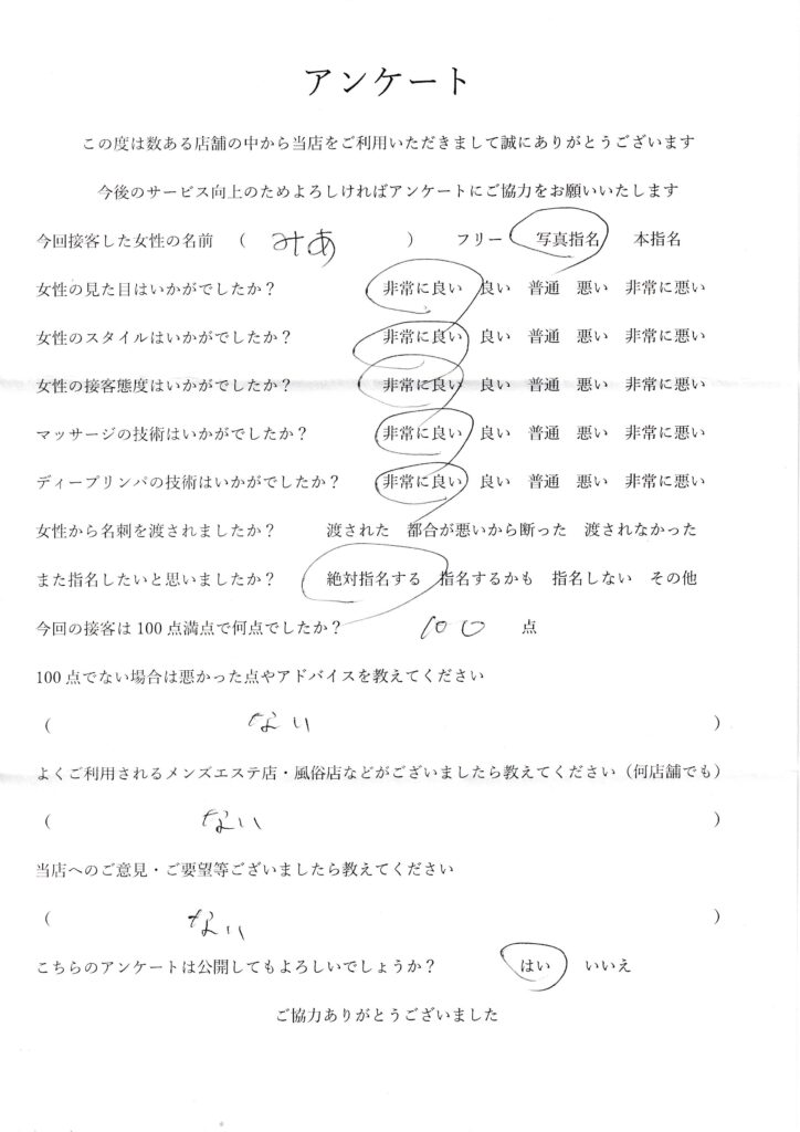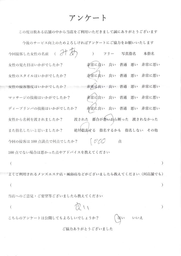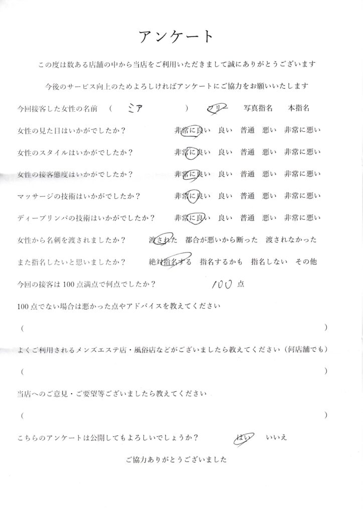 2024年7月19日吉田みあさんアンケート100点いただきました
