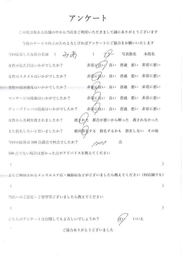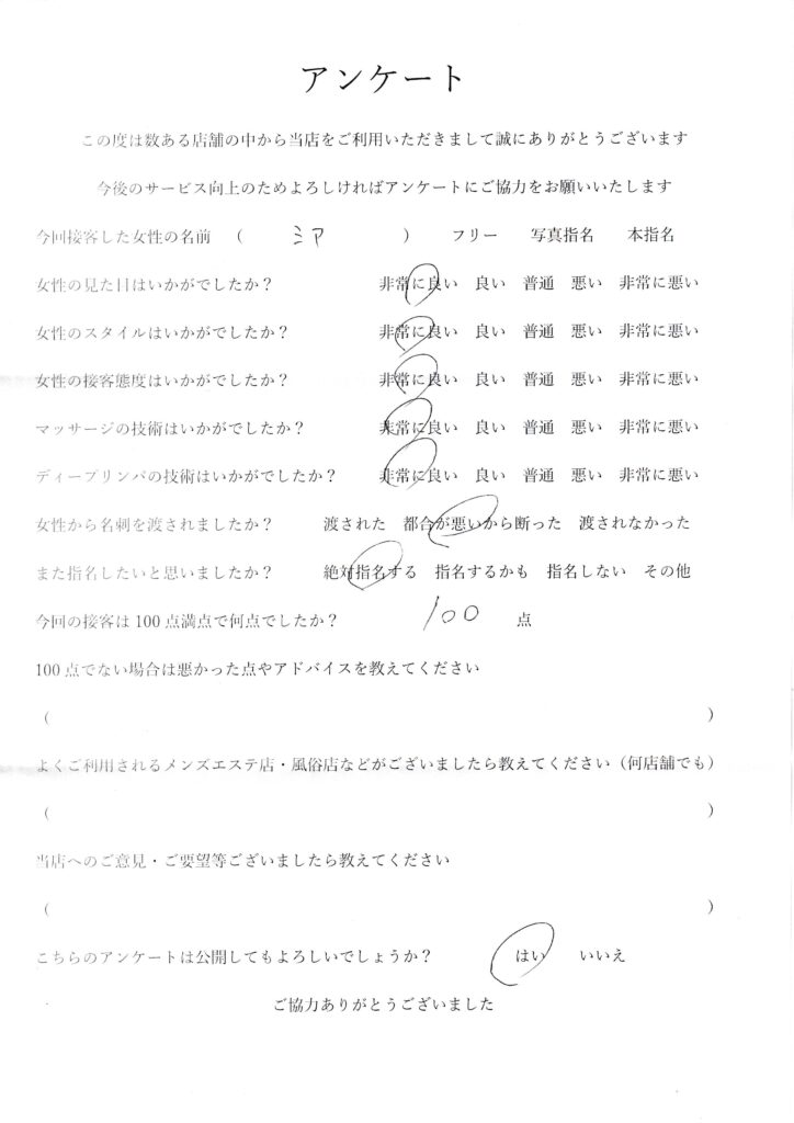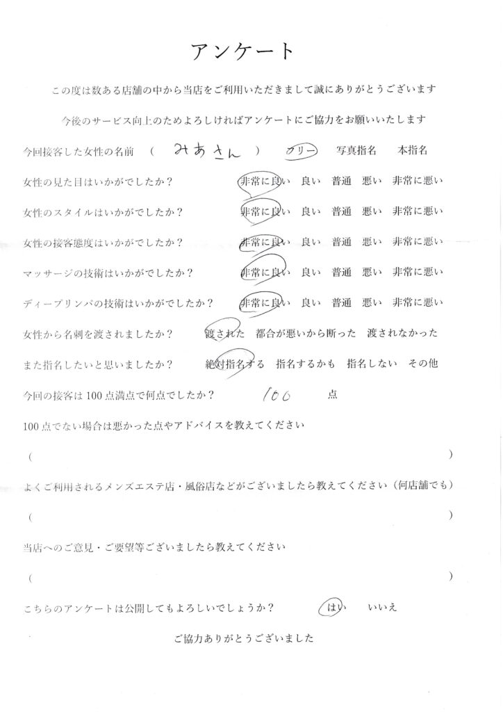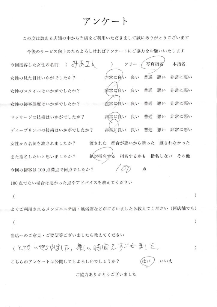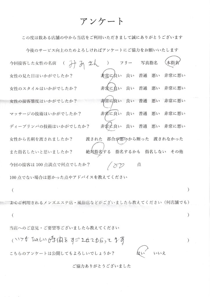2024年8月3日吉田みあさんアンケート100点いただきました