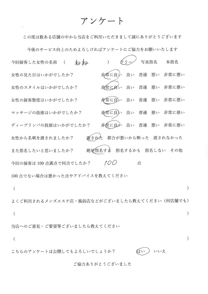 2023年12月25日鮎川ねねさんアンケート100点いただきました