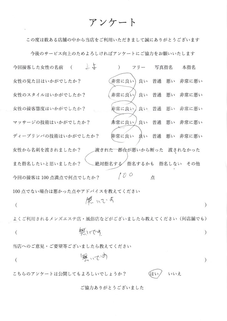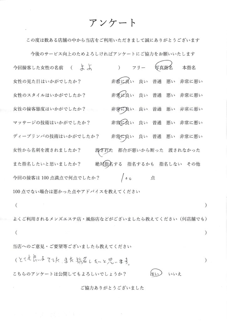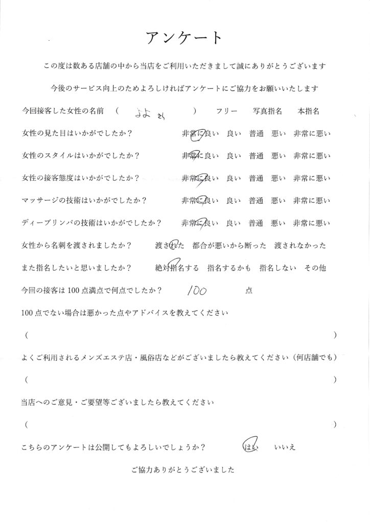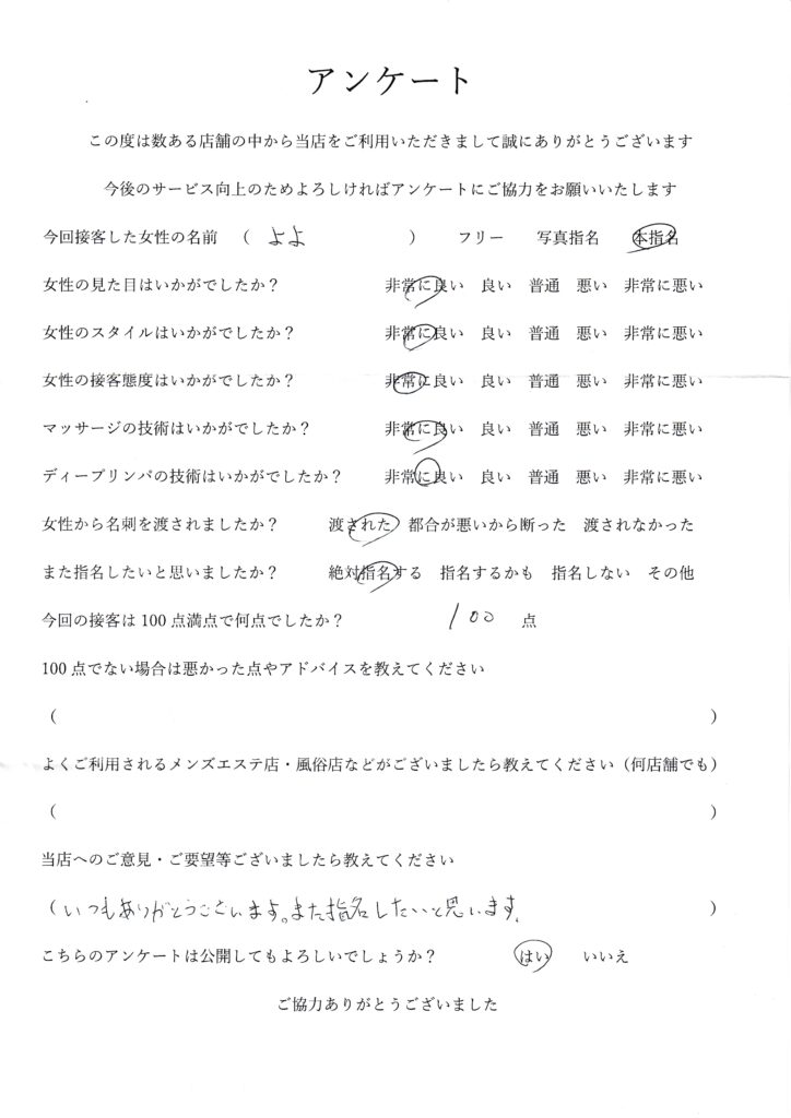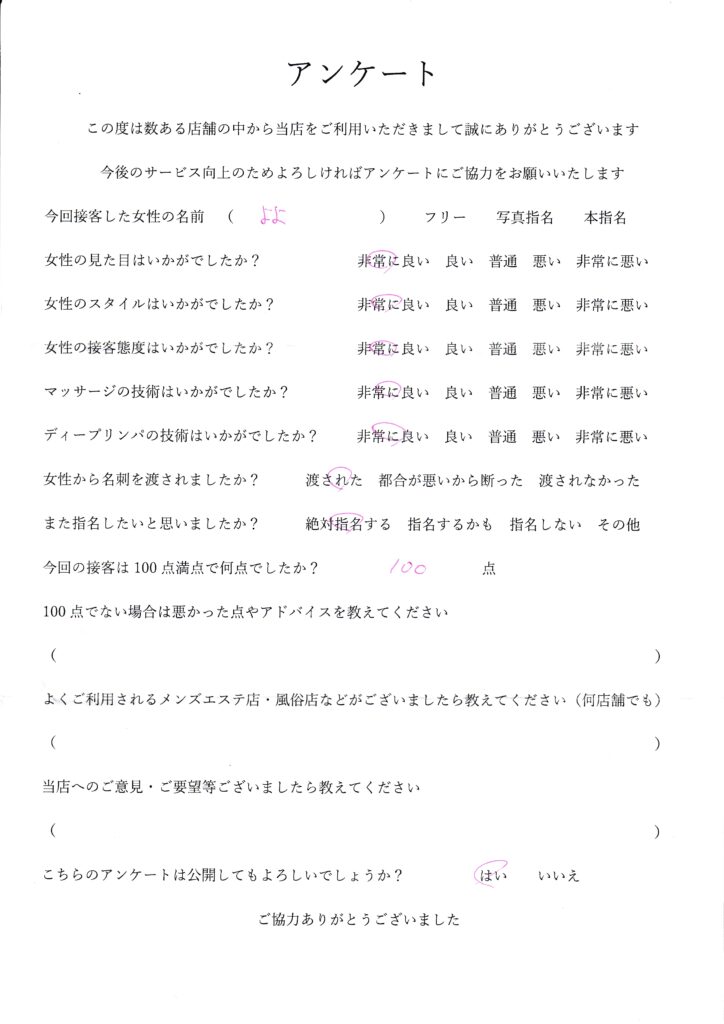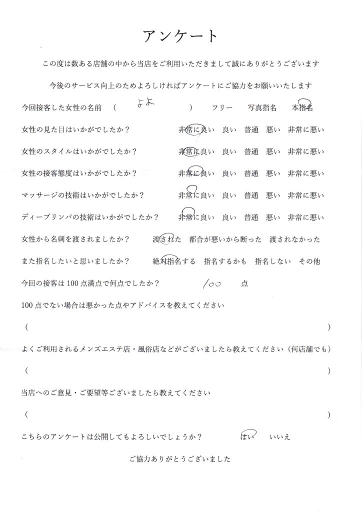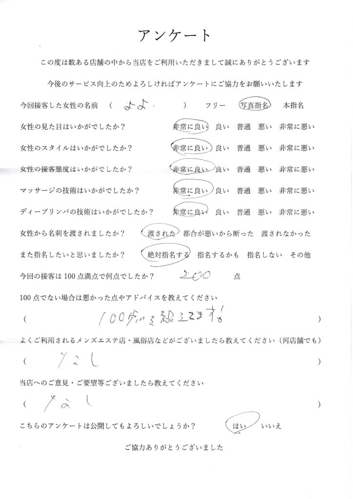 2025年6月29日一ノ瀬よよさんアンケート100点いただきました